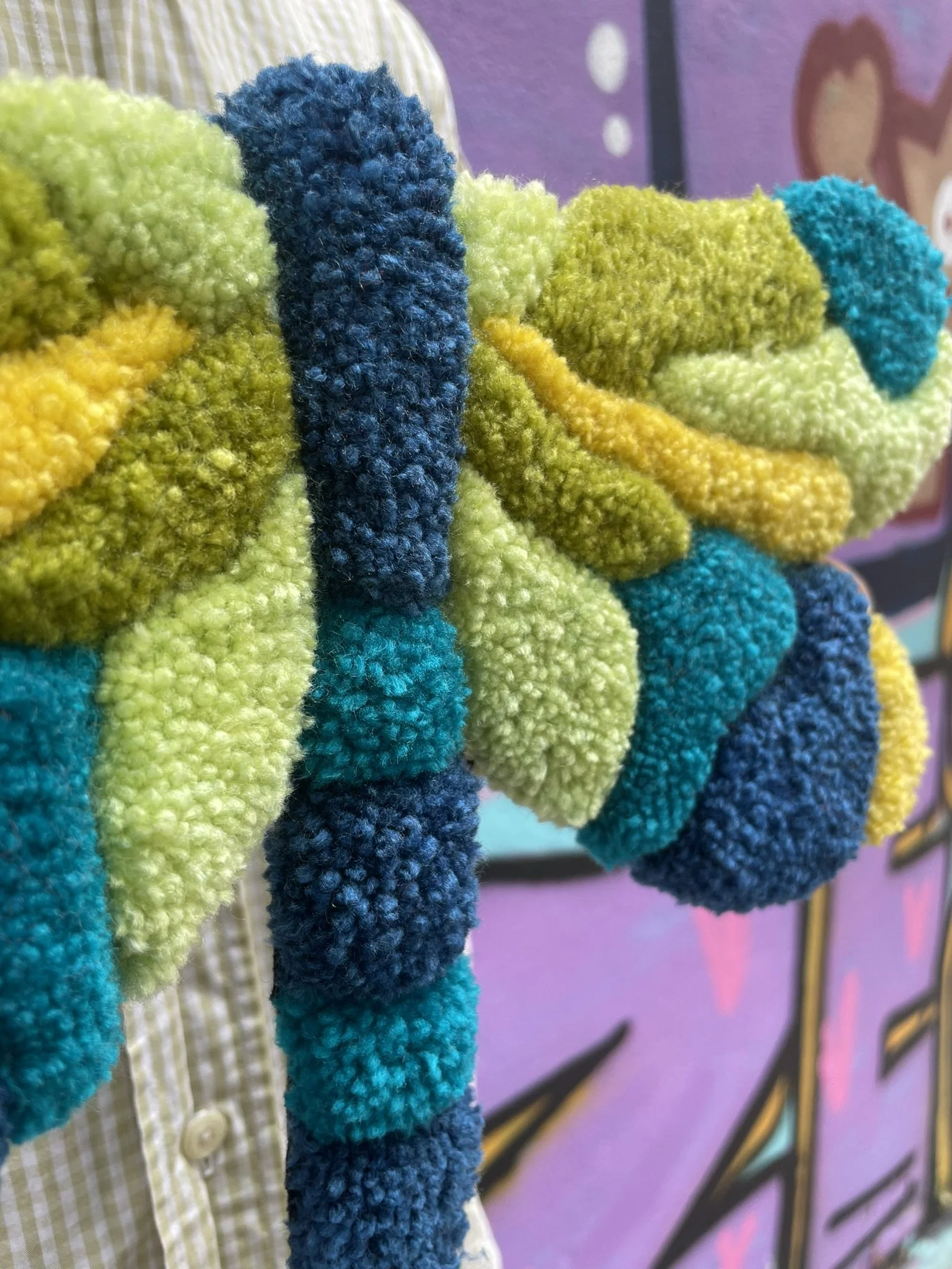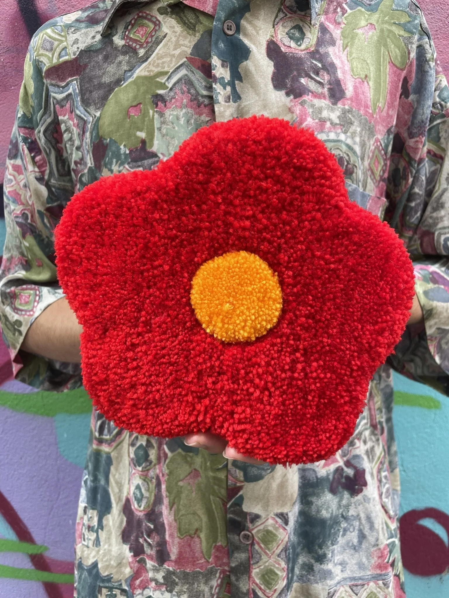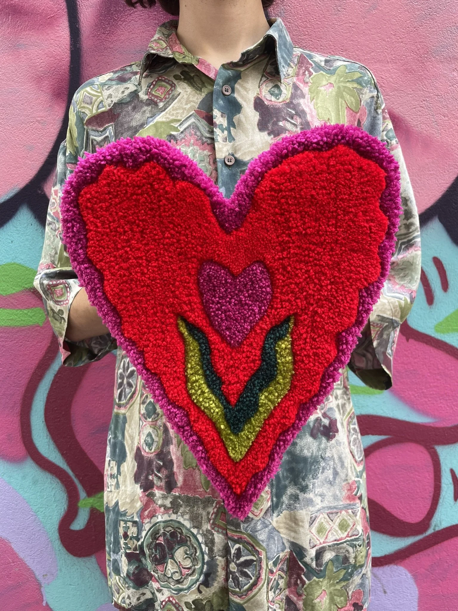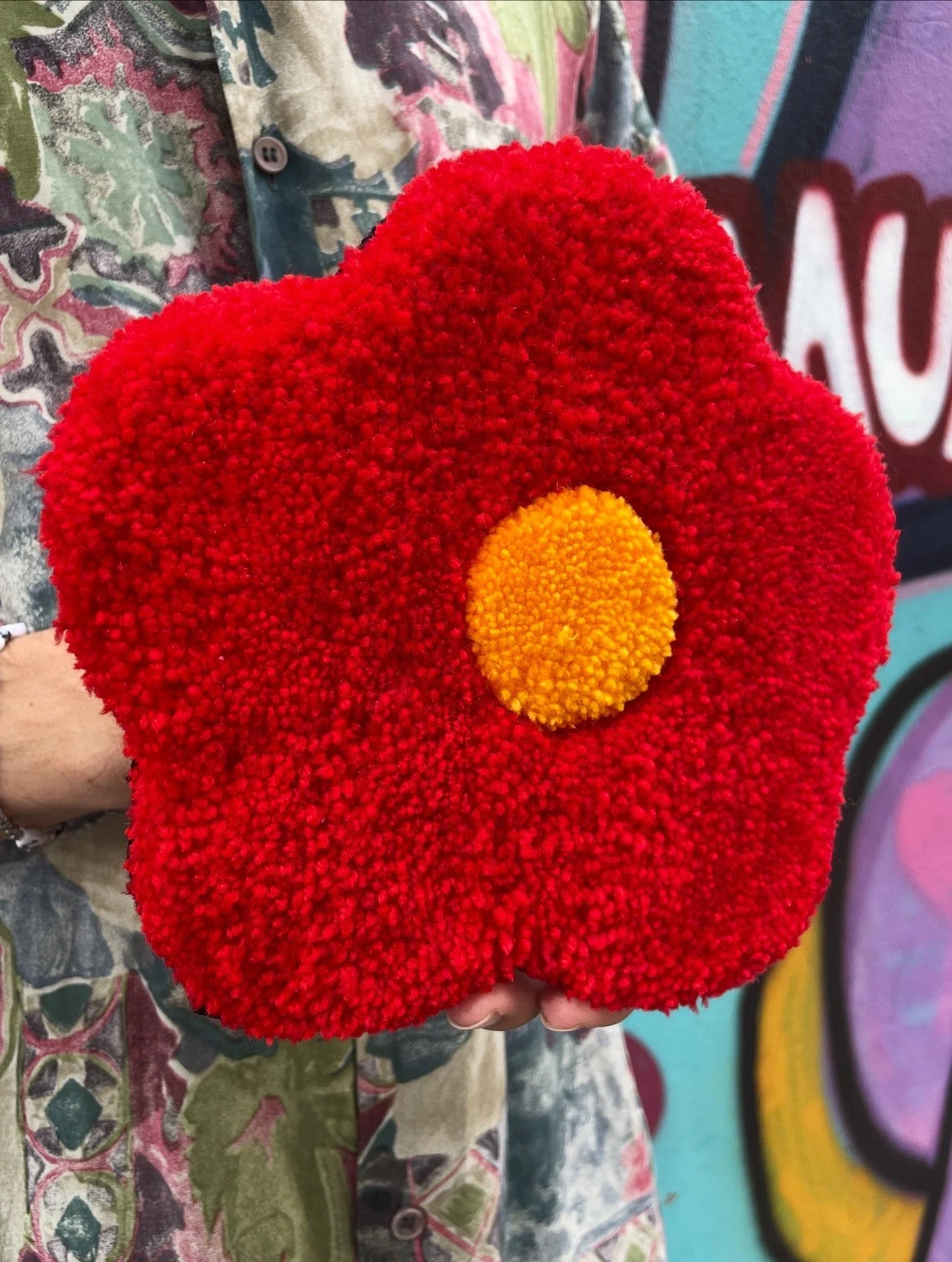 Cette création est entièrement réalisée à la main dans notre atelier. C’est une pièce aux formes organiques et aux couleurs éclatantes. Elle peut être utilisée aussi bien comme décoration murale que déposée au sol dans une pièce. Ce tapis incarne à la fois notre savoir-faire artisanal et notre démarche éco responsable. Son tissu de finition est de seconde main, chiné par nos soins.