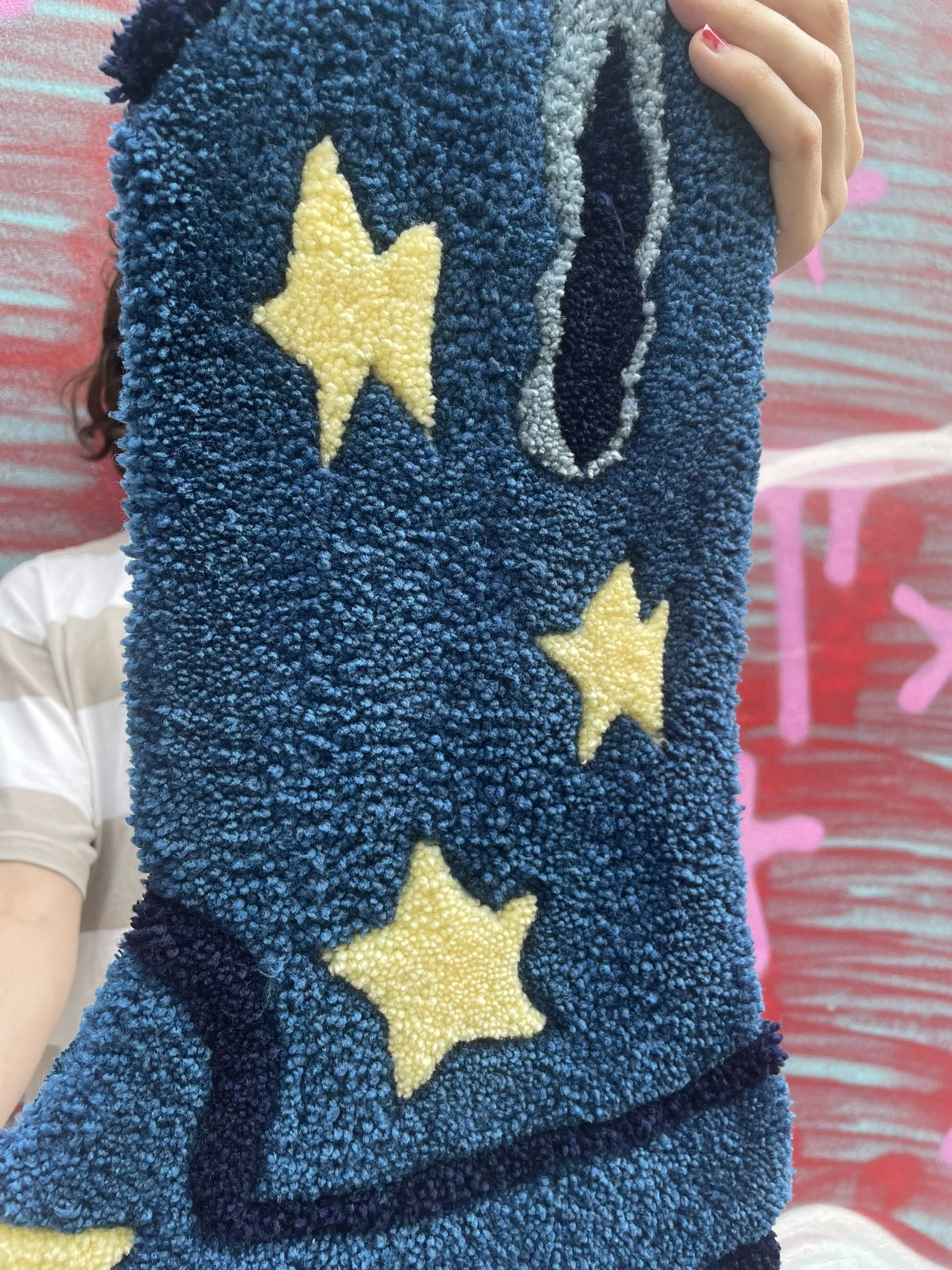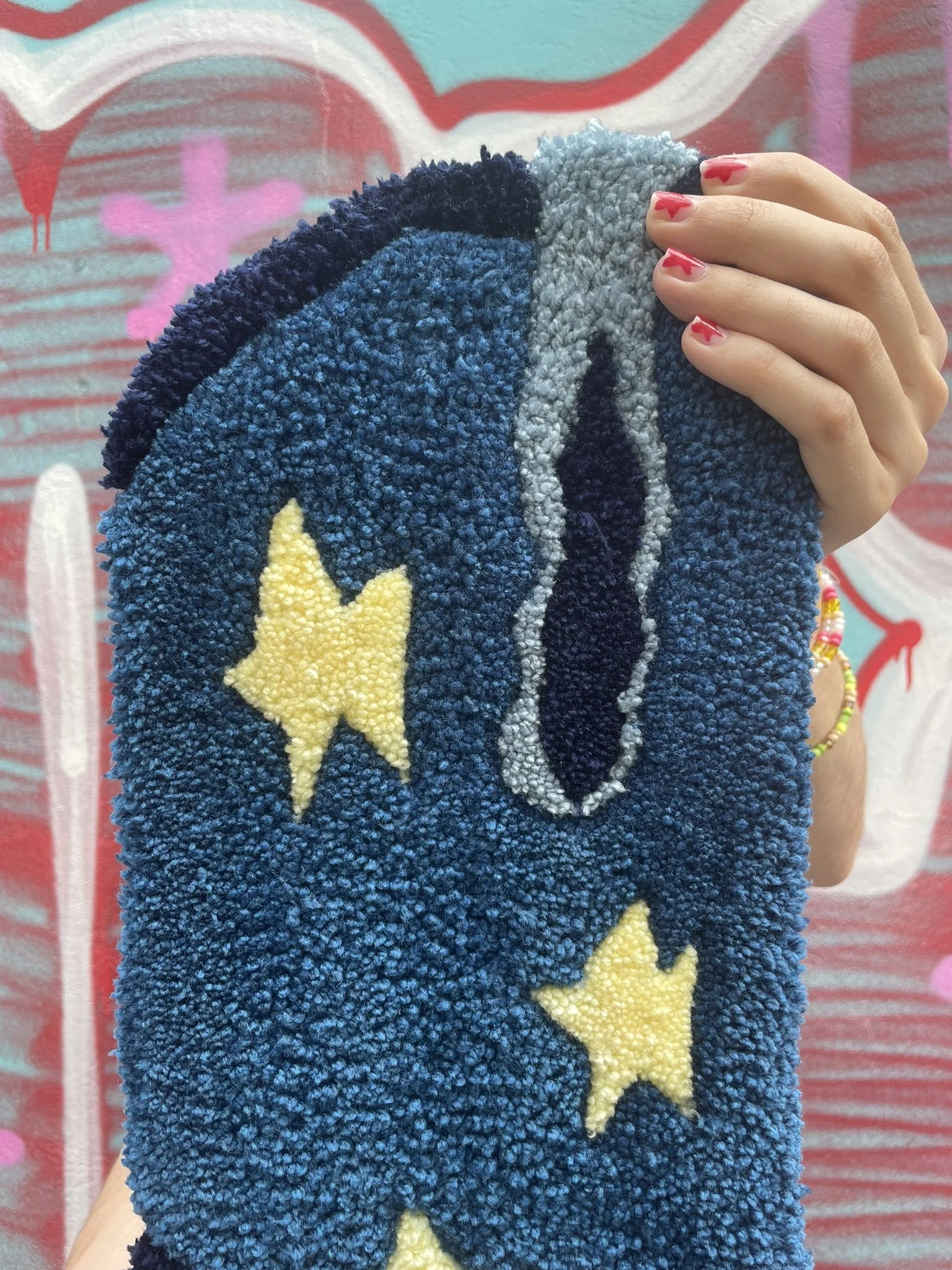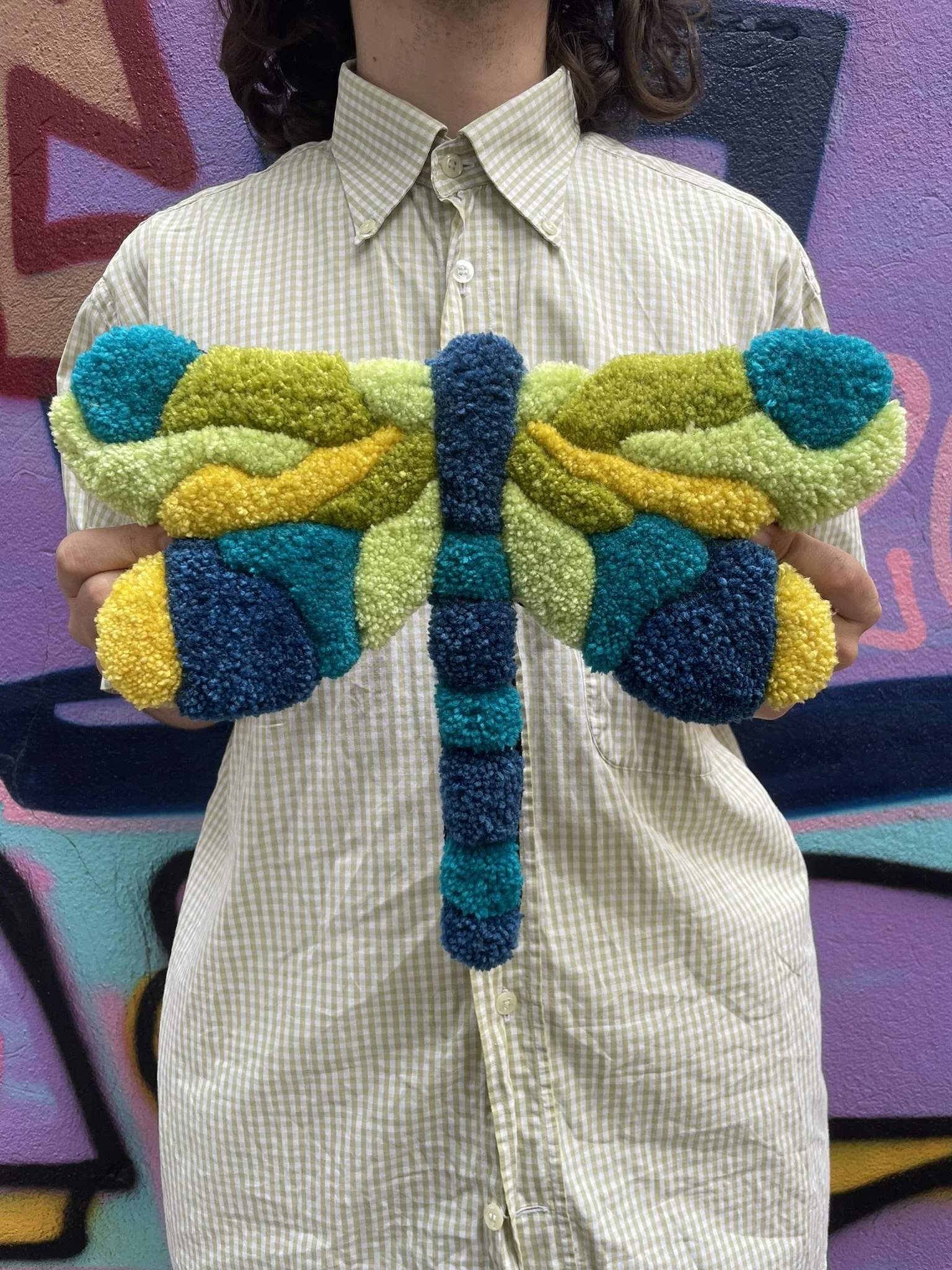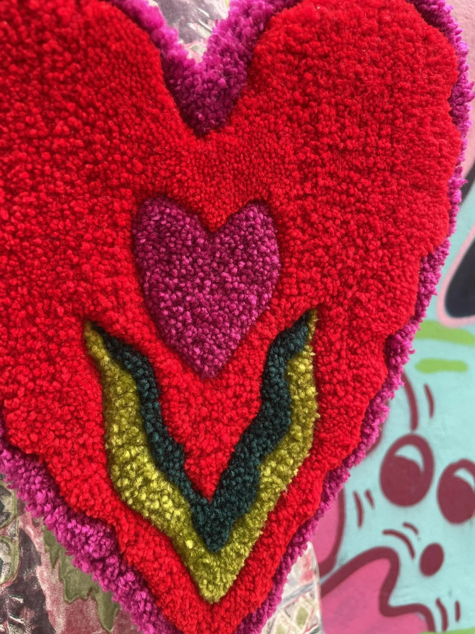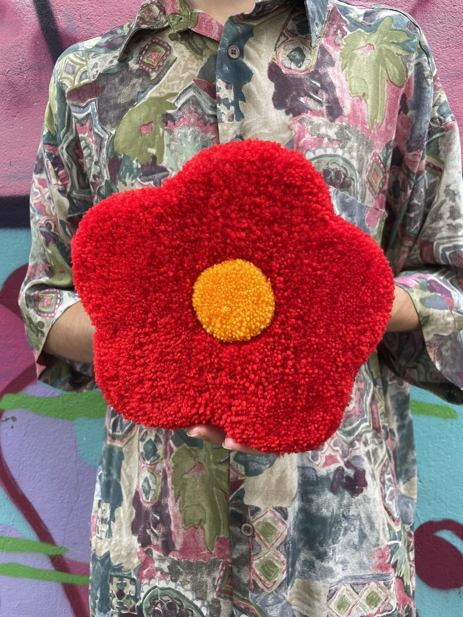 Cette création est entièrement réalisée à la main dans notre atelier. C’est une pièce aux formes organiques et aux couleurs éclatantes. Elle peut être utilisée aussi bien comme décoration murale que déposée au sol dans une pièce. Ce tapis incarne à la fois notre savoir-faire artisanal et notre démarche éco responsable. Son tissu de finition est de seconde main, chiné par nos soins.