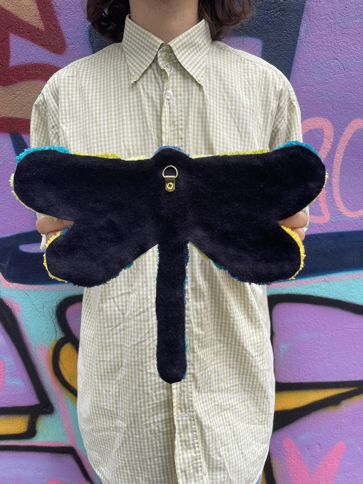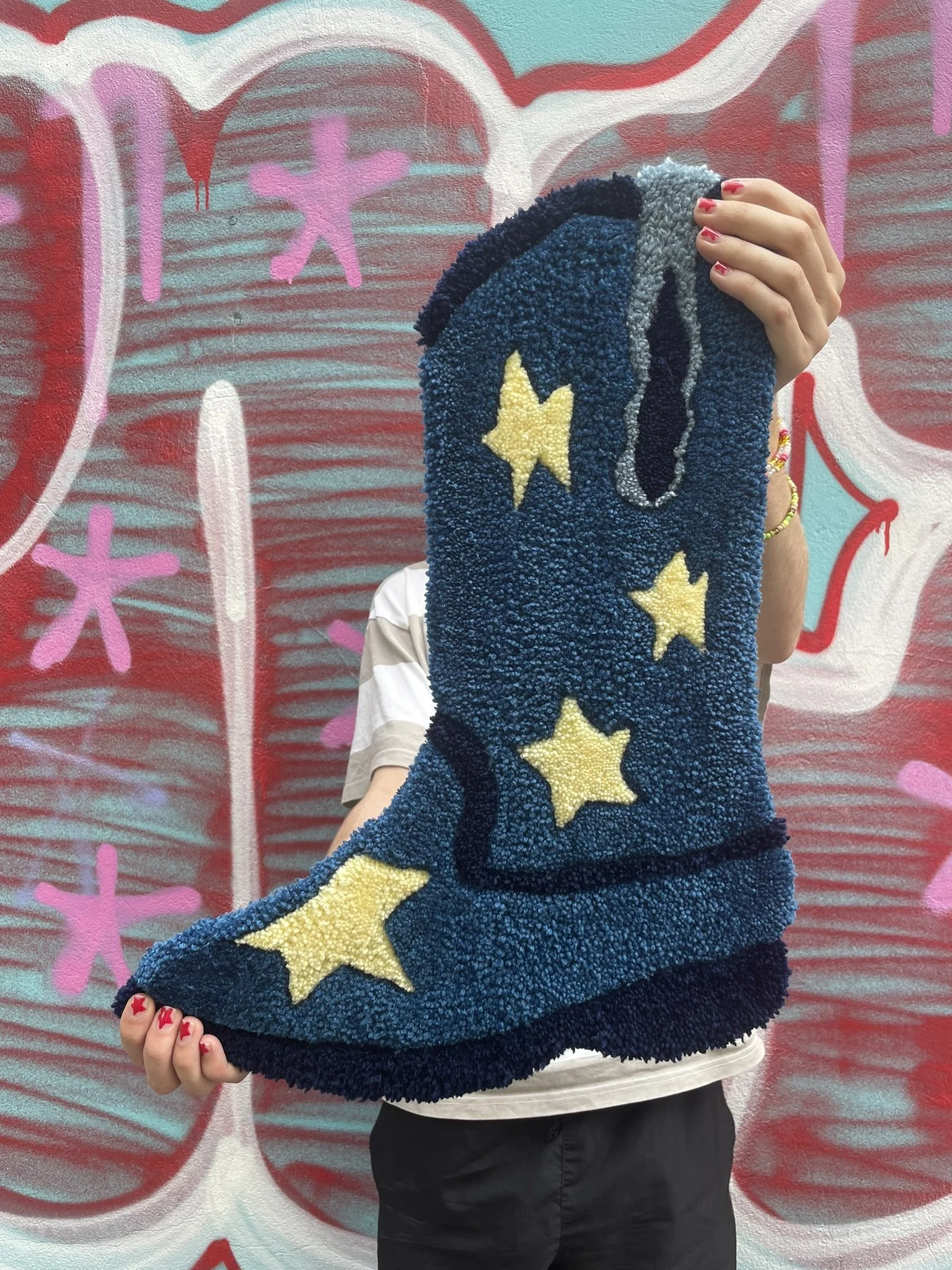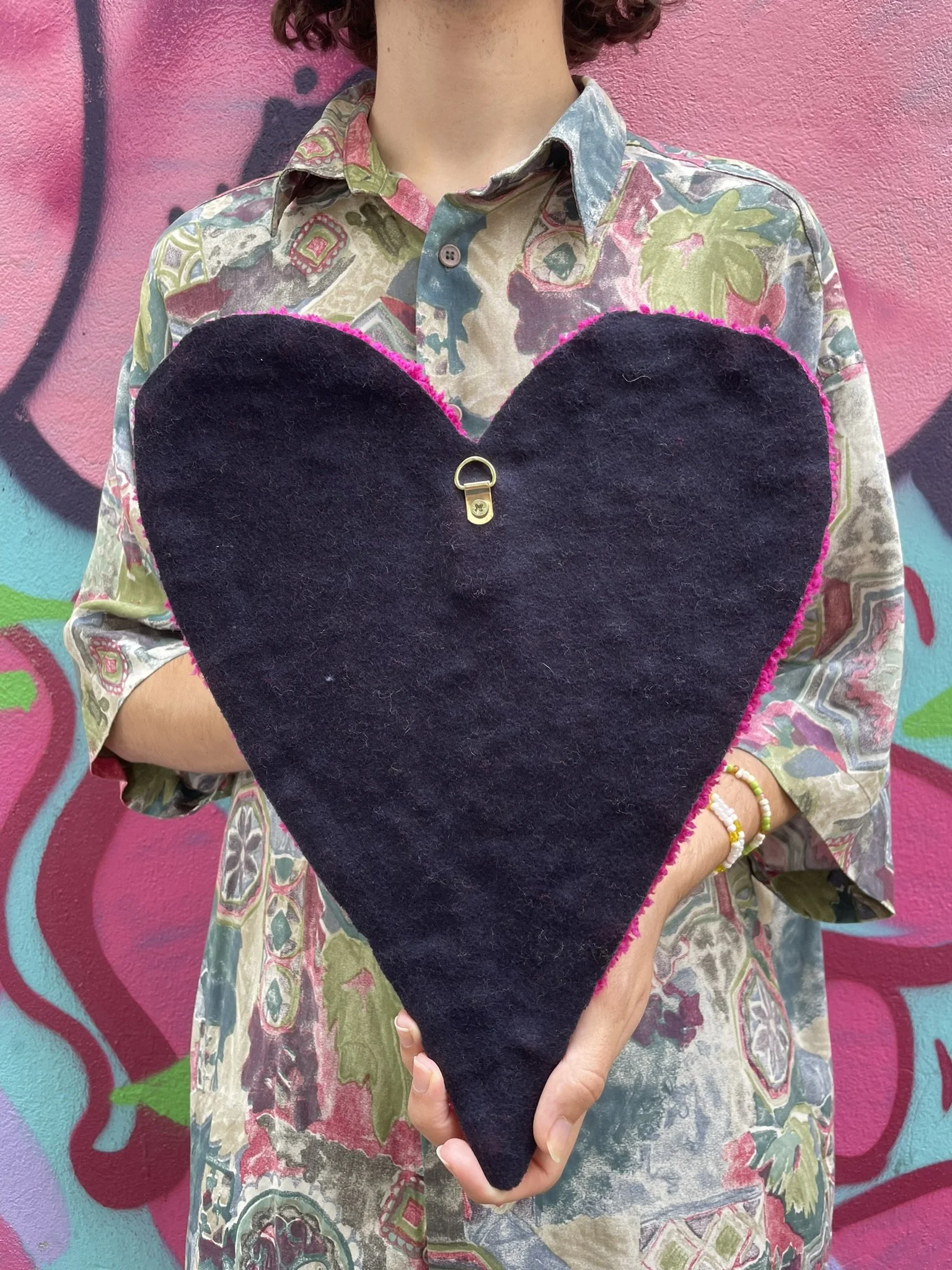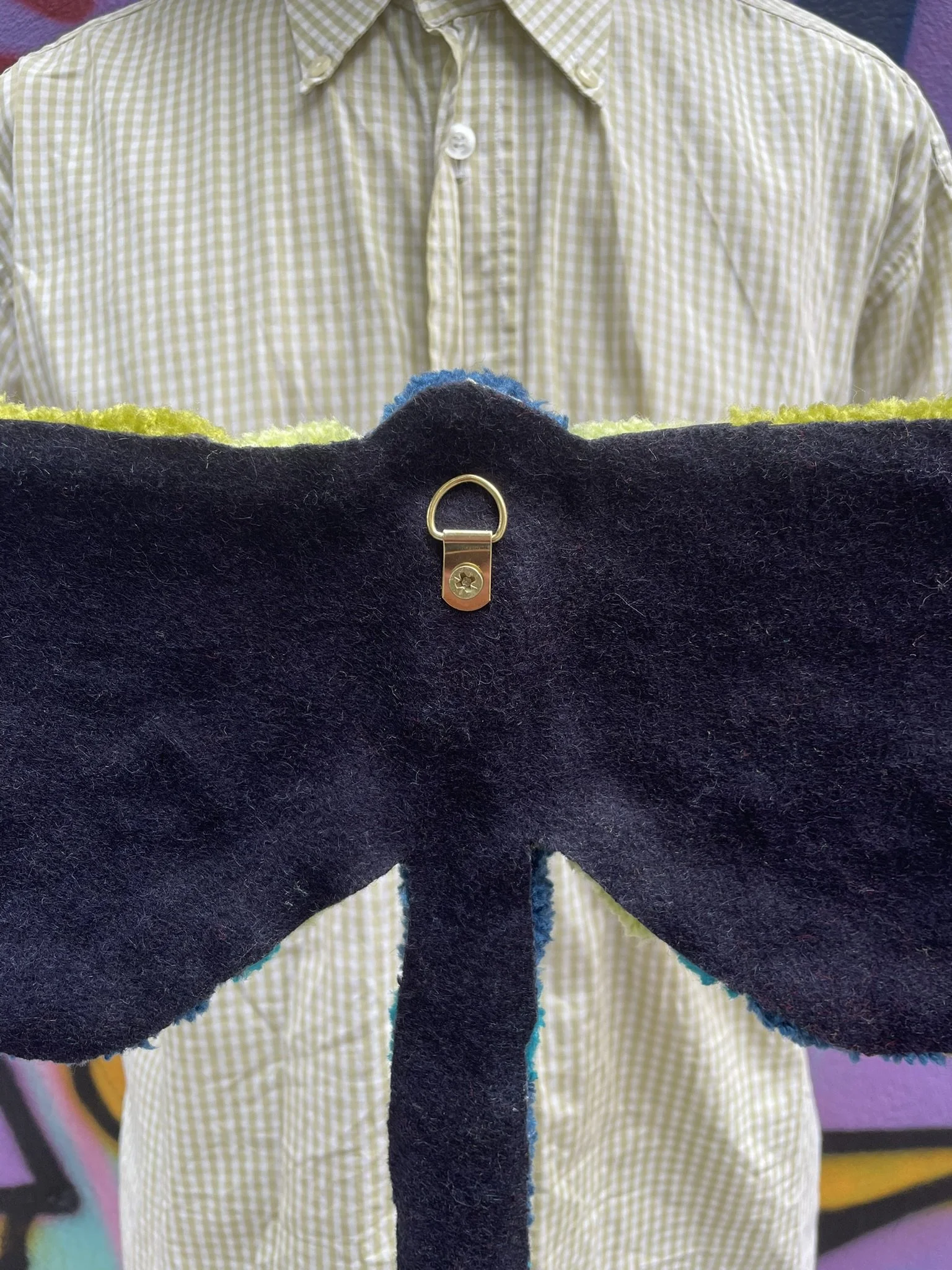 Cette création est entièrement réalisée à la main dans notre atelier. C’est une pièce aux formes organiques et aux couleurs éclatantes. Elle peut être utilisée aussi bien comme décoration murale que déposée au sol dans une pièce. Ce tapis incarne à la fois notre savoir-faire artisanal et notre démarche éco responsable. Son tissu de finition est de seconde main, chiné par nos soins.