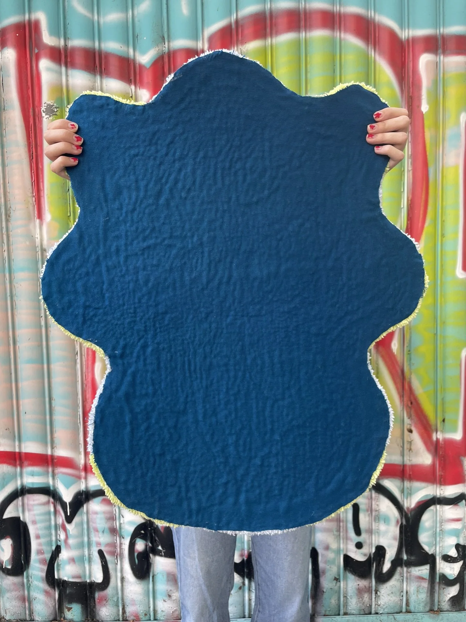 Cette santiag tuftée est entièrement réalisée à la main dans notre atelier. Le bleu profond se mêle aux éclats jaunes des étoiles pour donner naissance à une pièce décorative ludique et lumineuse.